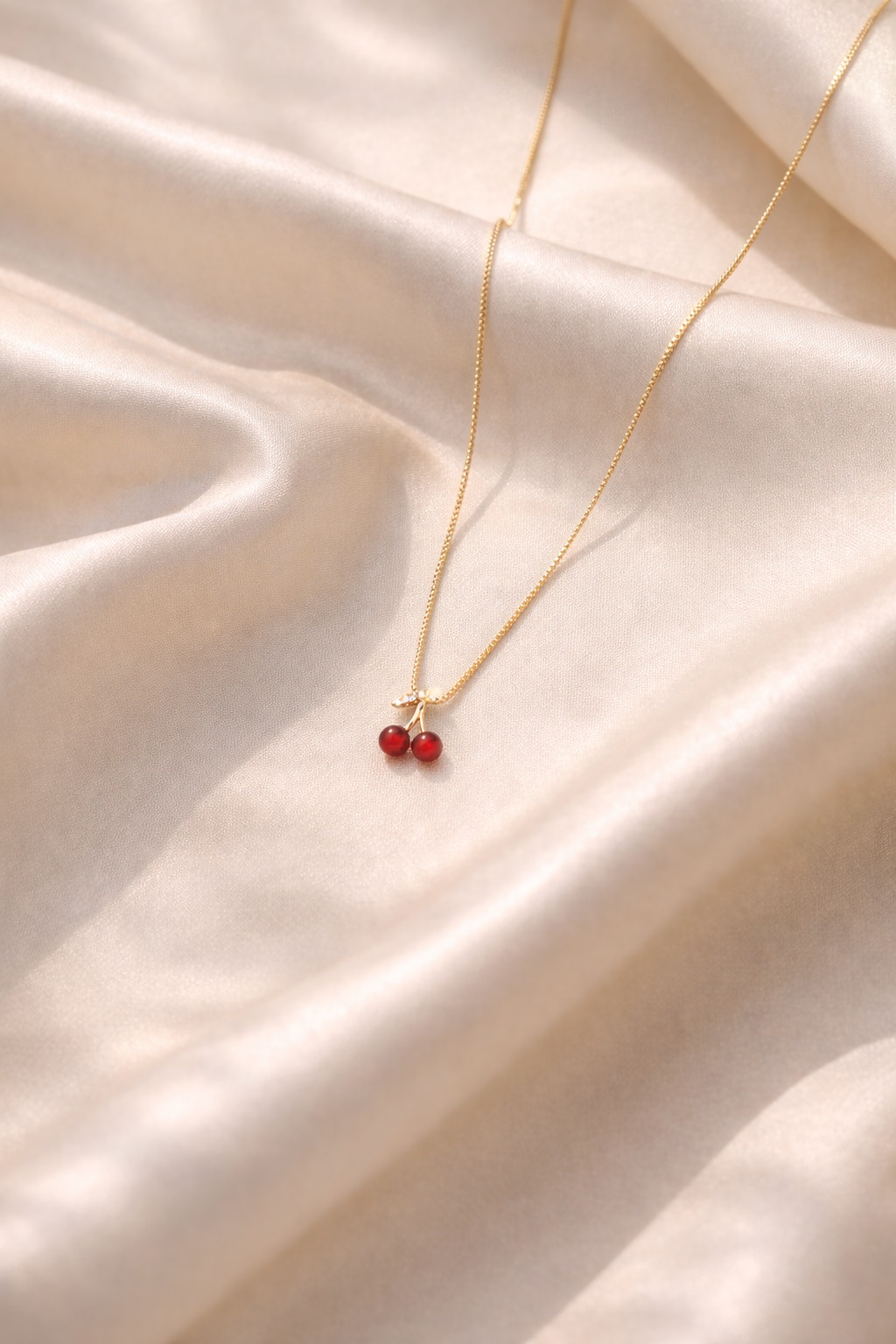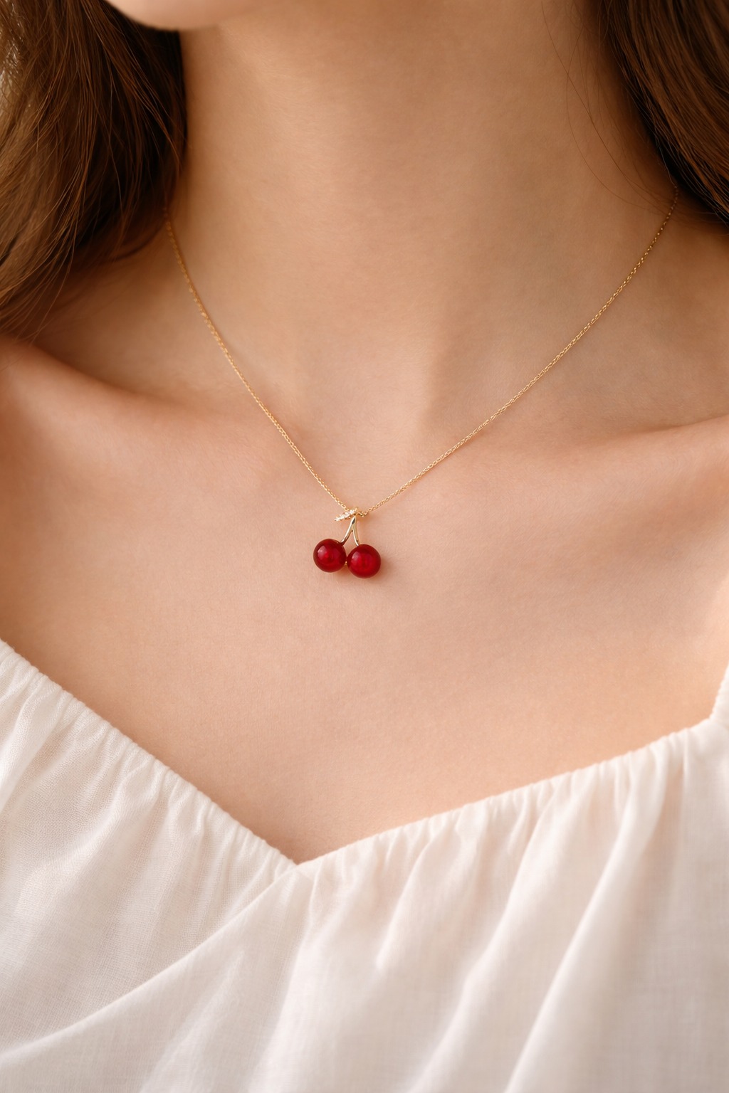 A delicate gold-toned chain featuring two glossy red cherry charms β€” sweet, minimal, and effortlessly charming. Perfect for everyday wear or layering for a playful pop of color.