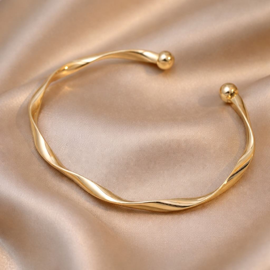 Elegant with a modern twist, the Elara Bangle features a sleek open-cuff design with a softly twisted silhouette and polished gold finish. The smooth curves and rounded ends create a refined, sculptural look that feels both bold and feminine.