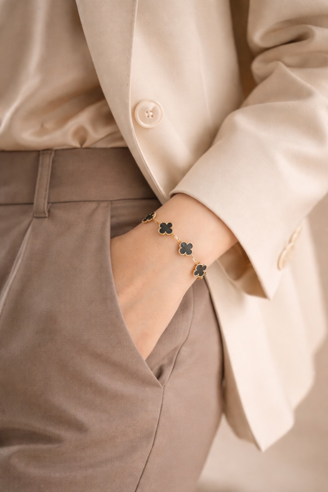 Chic, bold, and effortlessly elegant β€” the Luna Clover Bracelet in black features sleek clover charms framed in a radiant gold finish. The deep black accents create a striking contrast, adding a modern and sophisticated touch to your look.